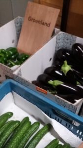Groenland produceert zijn biologische groenten in de kas. Daardoor zien wij nu al die vroege groentes. Heerlijk, en dat voor de redelijk prijs van €1,65 voor een pond aubergines(3 stuks), of €2,10 voor een pond paprika’s(ook 3 stuks) – bij het Voedselkollektief natuurlijk.