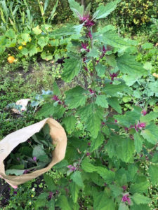 Bij het ophalen van groente kreeg ik bij de Glinstertuin zakjes van 250 gram met boomspinazie. Jos wilde het gewicht van de stengels niet in de prijs meenemen, dus haalde hij alle blaadjes van de stengel. Voor een kilo aan blaadjes was een hele plant nodig. Voor mij was het een verrassing om de plant te zien, waar deze blaadjes van af kwamen. Volgens Jos is het eigenlijk geen spinazie, maar familie van melde.