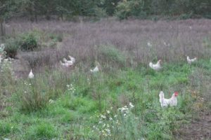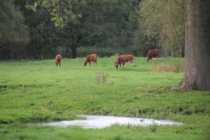 Hierna volgen foto’s van de runderen, varkens en kippen in hun natuurlijke omgeving. Vleesrunderen in een natuurlijk landschap met Barneveldse beek er tussendoor.