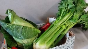 Geweldig zo’n grote bleekselderie en spitskool. De bleekselderie hier is afkomstig van Landgoed Zuylestein(Leersum), en die fraaie spitskool van Genus Loci(Vathorst, Amersfoort).