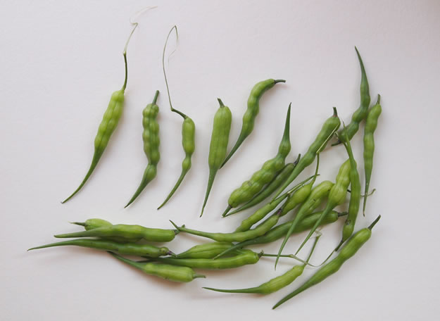Uiterlijk en smaak: de lange groene hauwtjes hebben een pittige smaak.